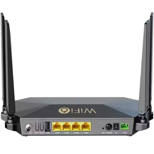 High-performance Dual Band WiFi 6 Router Featuring 4GE Ports, GPON or EPON Compatibility, and Catv Support. Compact, Energy Efficient Design.