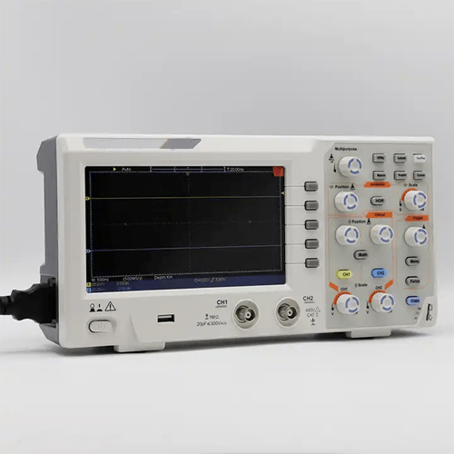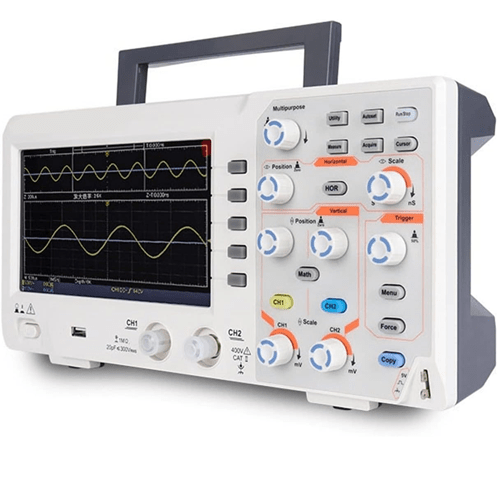 This Digital Oscilloscope has a bandwidth of 100 MHz, sample rate of 1 GS or s, the rise time of ≤3.5 ns, 2 channels, and memory depth of 10 K.