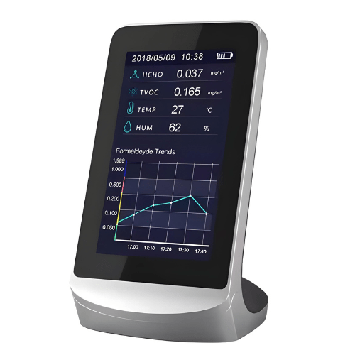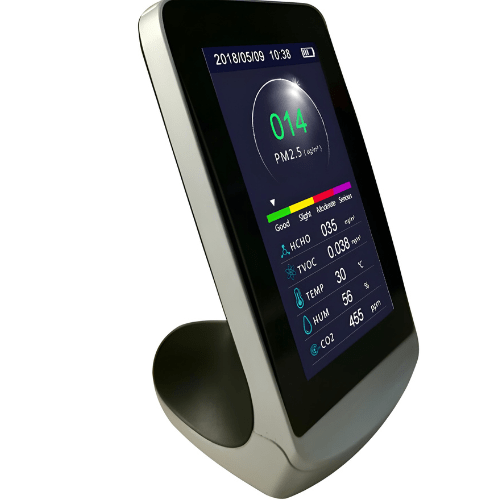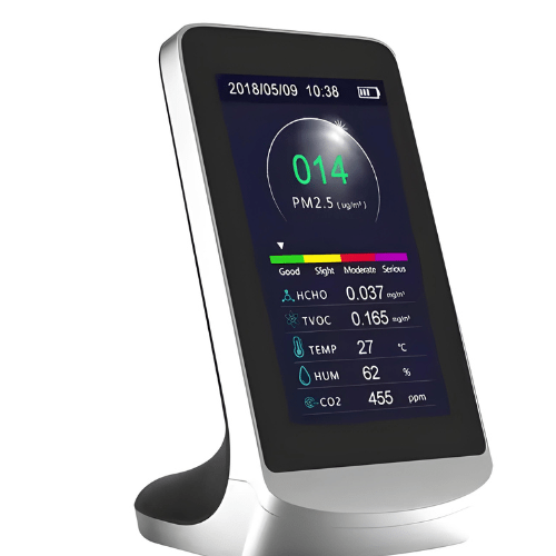 Hospitality Enviro Tech negative ions air quality tester is a multifunctional air quality monitor that detects Carbon dioxide (CO2), Formaldehyde (HCHO). Total Volatile Organic Compounds (TVOC), Particulate Matter <2.5 micron-sized particles (PM 2.5 PM 1.0 PM 10), Temperature, and Humidity with clock and record function. It combines multiple air sensors with a built-in fan to allow real-time monitoring of Carbon dioxide (CO2), formalde- hyde (HCHO), total volatile organic compounds (TVOC), temperature, and humidity on its digital LCD display.