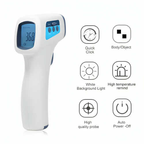 This Non-Contact Infrared Body Thermometer has a relative humidity of 70 kPa to 106 kPa, auto power off, and a white backlight.